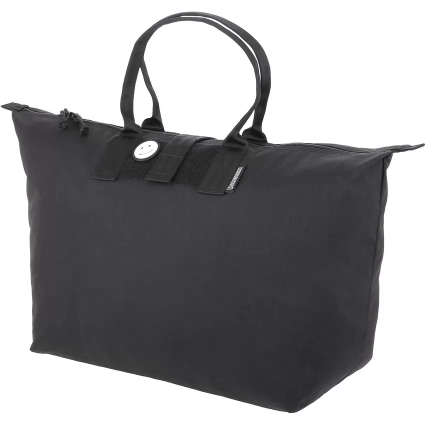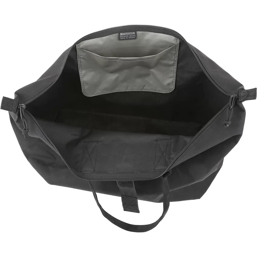 Dimensions: 10" x 25" x 14". Pack size: 1" x 9" x 5". 25L capacity. Main compartment with dual zippers. 22" large zipper opening for easy access. 3" x 5" loop field for patches. Dual seat belt carry handle. Wide base for sitting upright. One-piece fabric construction. Folds to compact size for storage. Paracord pullers. 500D nylon construction. Color: Black. Bulk packed.
