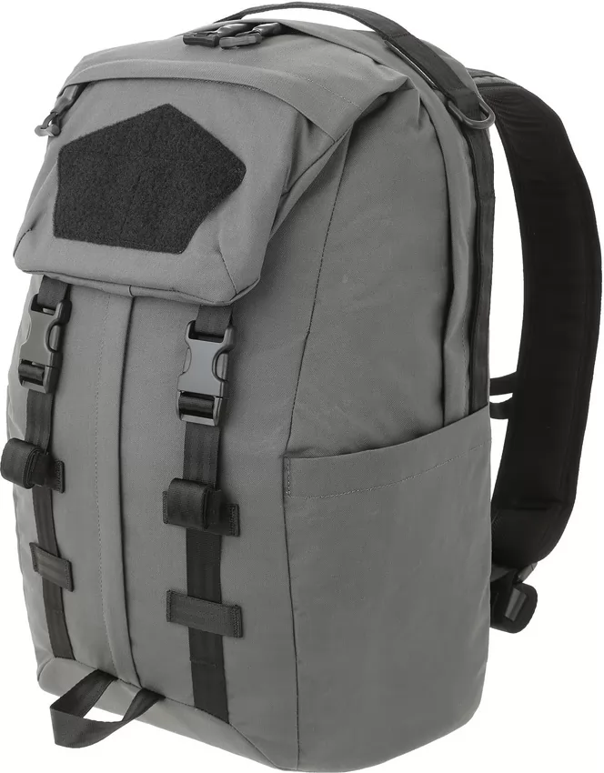 Dimensions: 8.5" x 11" x 19". 26L capacity. Main compartment with two-way access. Padded bottom. Rear interior sleeve fits 15" laptop or large tablet. 3.75" x 6" loop field for patches. Dual side pockets with adjustable bungee cord retention. Dual front compression straps with side release buckles. Top zippered flap pocket. Multiple grab handle on top and sides. Dual access CCW compartment with security lockout strip. Padded shoulder strap with quick release buckles. Adjustable and removable sternum straps. Hook and loop wings for managing slack webbing. Removable 1" hip belt with side release buckle. Field replaceable 1" Duraflex side release buckles. Assorted interior side wall mesh pockets. Zipper pulls with shrink wrapped webbing and plastic fobs. Skin-friendly seat belt webbing. 500D nylon construction. Color: Wolf Gray. Bulk packed.