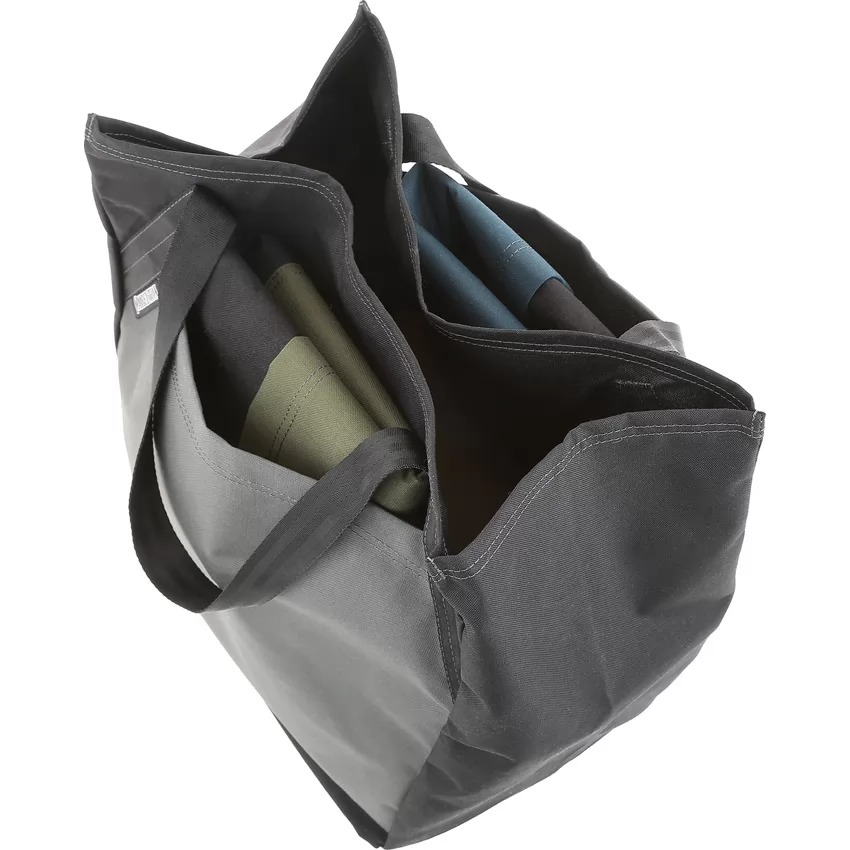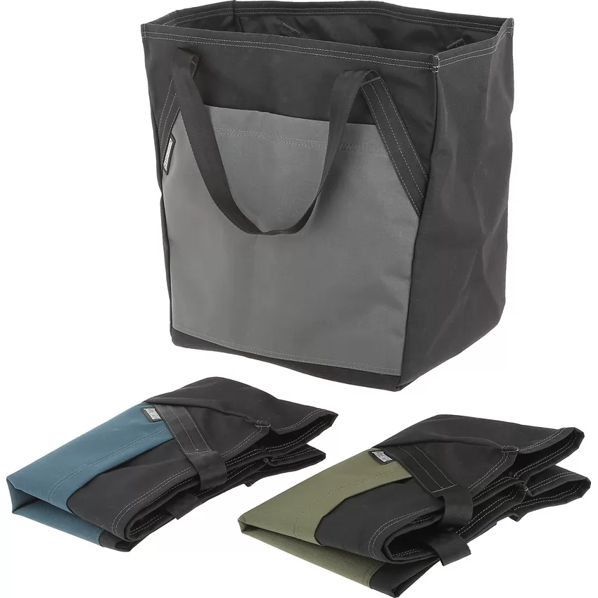 Dimensions: 13.5" x 12.5" x 7.5". 21 liter capacity. Set of three totes, one each: Wolf gray, OD green, Dark blue. Reinforced handles and integral bottom for strength. Sleeve pockets in front and back will fit the other two totes folded. Tested to 120 pounds. 15% larger than typical paper grocery bags. 500D nylon construction. Bulk packed.