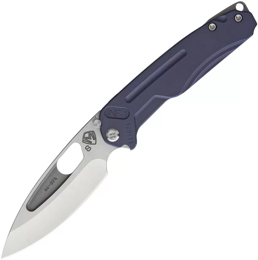 Infraction Framelock. 4.5" closed. 3.5" tumbled finish S35VN stainless blade. Blue anodized titanium handle. Extended tang. Lanyard hole. Thumb pull. Pocket clip. Watertight storage case. Boxed.