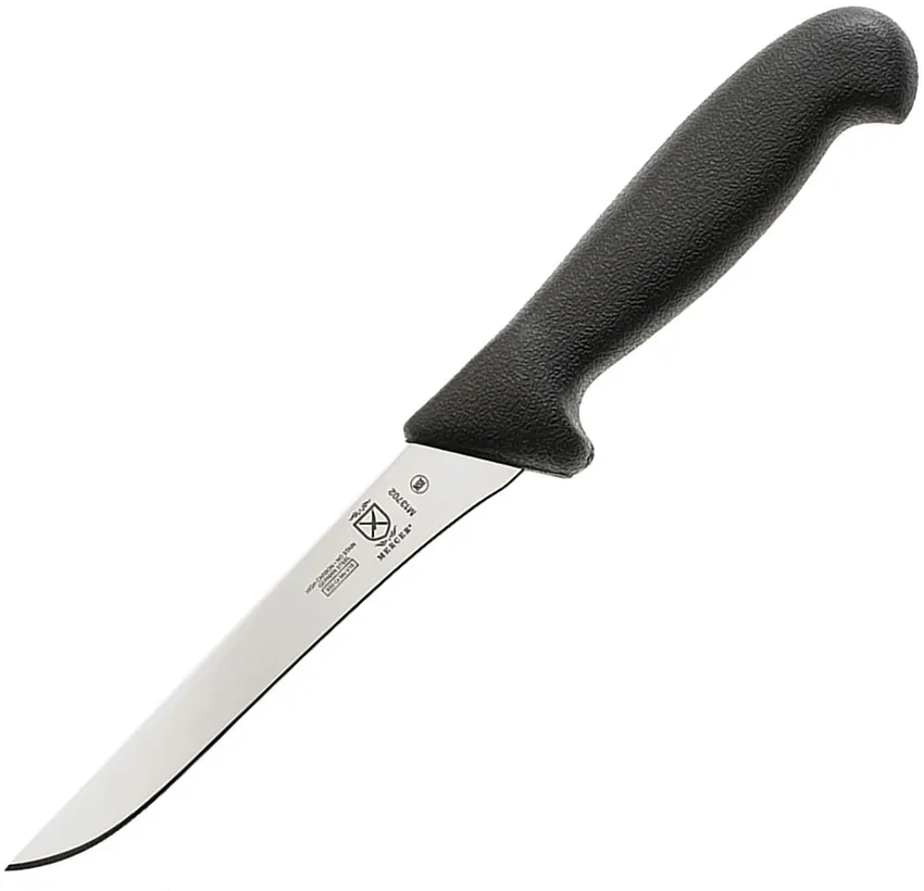 The Mercer BPX Boning Stiff, model BRK-MCR13702, offers exceptional performance and durability for precise meat and poultry preparation. Crafted with high-carbon stain-free steel, the blade delivers optimal sharpness and edge retention. Its ergonomic handle ensures a comfortable and secure grip, reducing fatigue during extended use. This boning knife facilitates efficient deboning and trimming, a valuable tool for both professional chefs and home cooks seeking quality and reliability. 11" (27.94cm) overall. 6" (15.24cm) polished X50CrMoV15 stainless blade. Black GRN handle. Stiff blade. Clam packed.