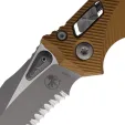 5.38" (13.67cm) closed. 4" (10.16cm) Apocalyptic finish partially serrated Bohler M390MK stainless blade. Tan G10 handle. Pocket clip. Lanyard hole. Fluted handles. Unique thumb stud opener with ball bearing pivot. Microtech item# 137RL-11APFLTA Boxed.