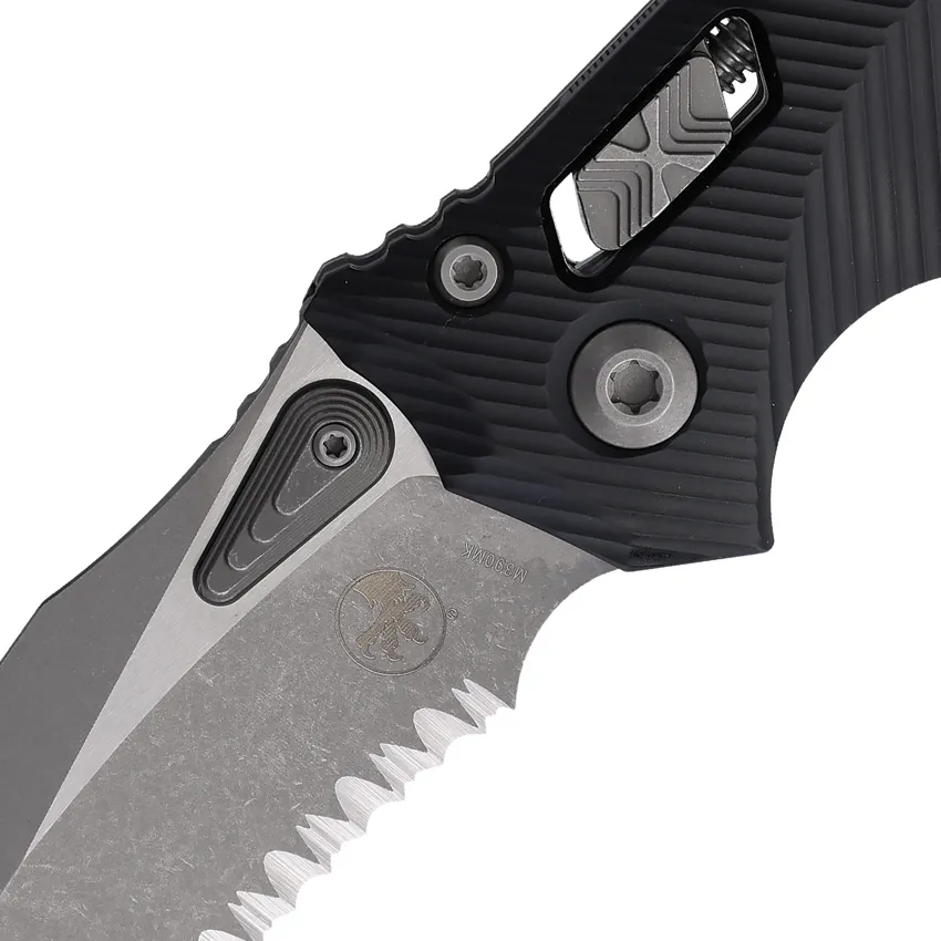 5.38" (13.67cm) closed. 4" (10.16cm) Apocalyptic finish partially serrated Bohler M390MK stainless blade. Black fluted aluminum handle. Pocket clip. Lanyard hole. Unique thumb stud opener with ball bearing pivot. Microtech item #137RL-11APFL. Boxed.