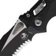 5.38" (13.67cm) closed. 4" (10.16cm) two-tone finish partially serrated Bohler M390MK stainless blade. Black aluminum handle. Pocket clip. Lanyard hole. Unique thumb stud opener with ball bearing pivot. Microtech item #137RL-2FL. Boxed.