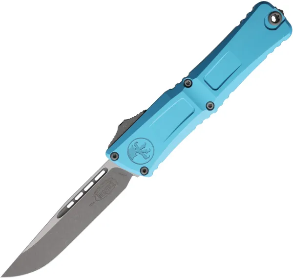 Automatic opening. 5.5" (13.97cm) closed. 4" (10.16cm) Apocalyptic finish premium steel blade. Turquoise aluminum handle. Pocket clip. Lanyard hole. Glass breaker. Boxed.