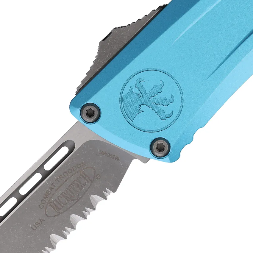 Automatic opening. 5.5" (13.97cm) closed. 4" (10.16cm) Apocalyptic finish partially serrated premium steel blade. Turquoise aluminum handle. Pocket clip. Lanyard hole. Glass breaker. Boxed.