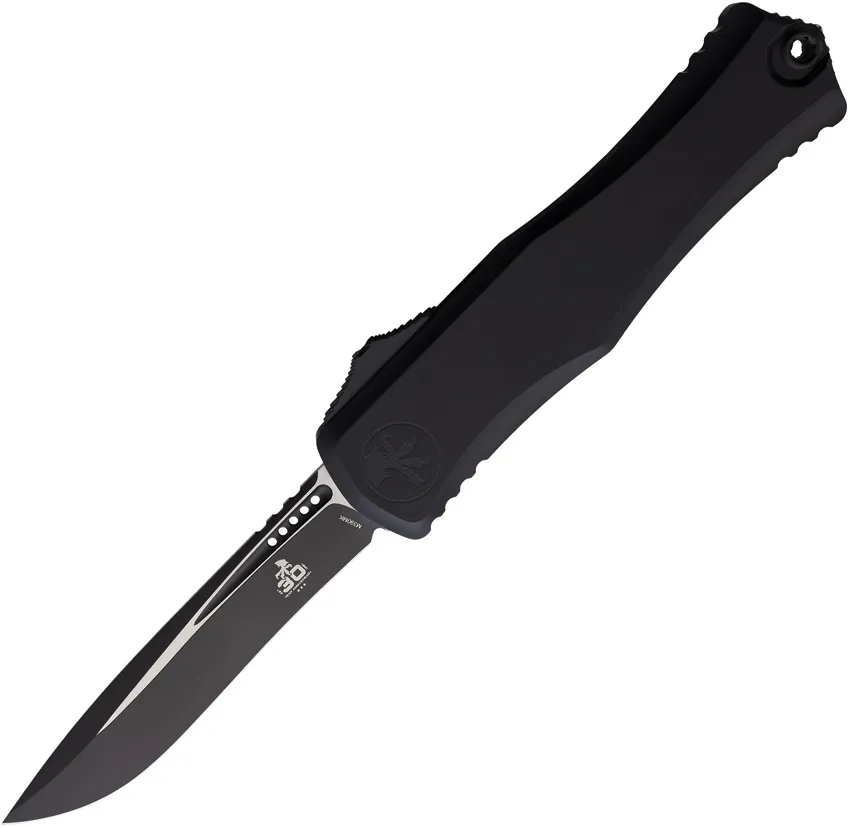 Automatic opening. 5.5" (13.97cm) closed. 4" (10.16cm) two-tone finish Bohler M390MK stainless recurve blade. Black aluminum handle. Pocket clip. Lanyard hole. Glass breaker. 30th anniversary edition. Boxed.