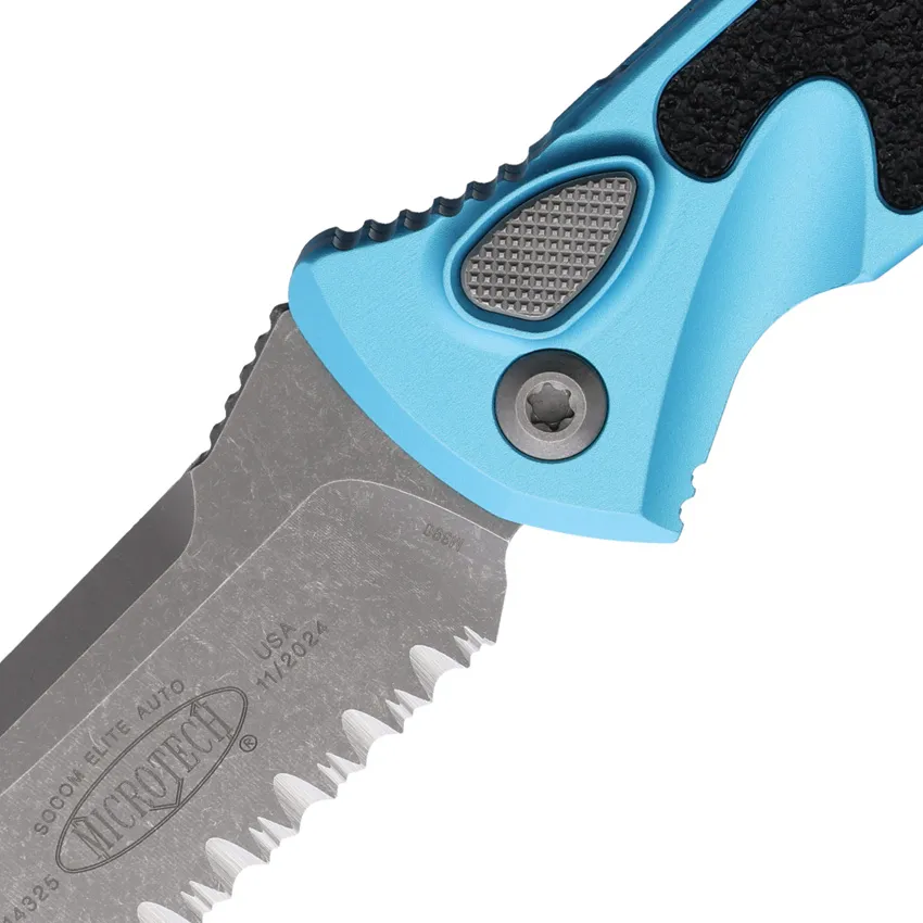 Automatic opening. 5.13" (13.03cm) closed. 4" (10.16cm) Apocalyptic finish partially serrated premium steel blade. Turquoise aluminum handle with black traction insert. Thumb stud. Lanyard hole. Glass breaker. Pocket clip. Boxed.