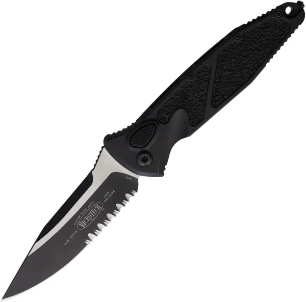 Automatic opening. 5.13" (13.03cm) closed. 4" (10.16cm) two-tone finish partially serrated premium steel blade. Black aluminum handle with black traction insert. Thumb stud. Lanyard hole. Glass breaker. Pocket clip. Boxed.