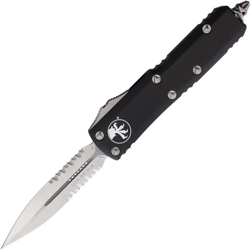 Automatic opening. 4.5" (11.43cm) closed. 3.13" (7.95cm) satin finish partially serrated premium steel dagger blade. Black aluminum handle. Glass breaker. Lanyard hole. Pocket clip. Boxed.