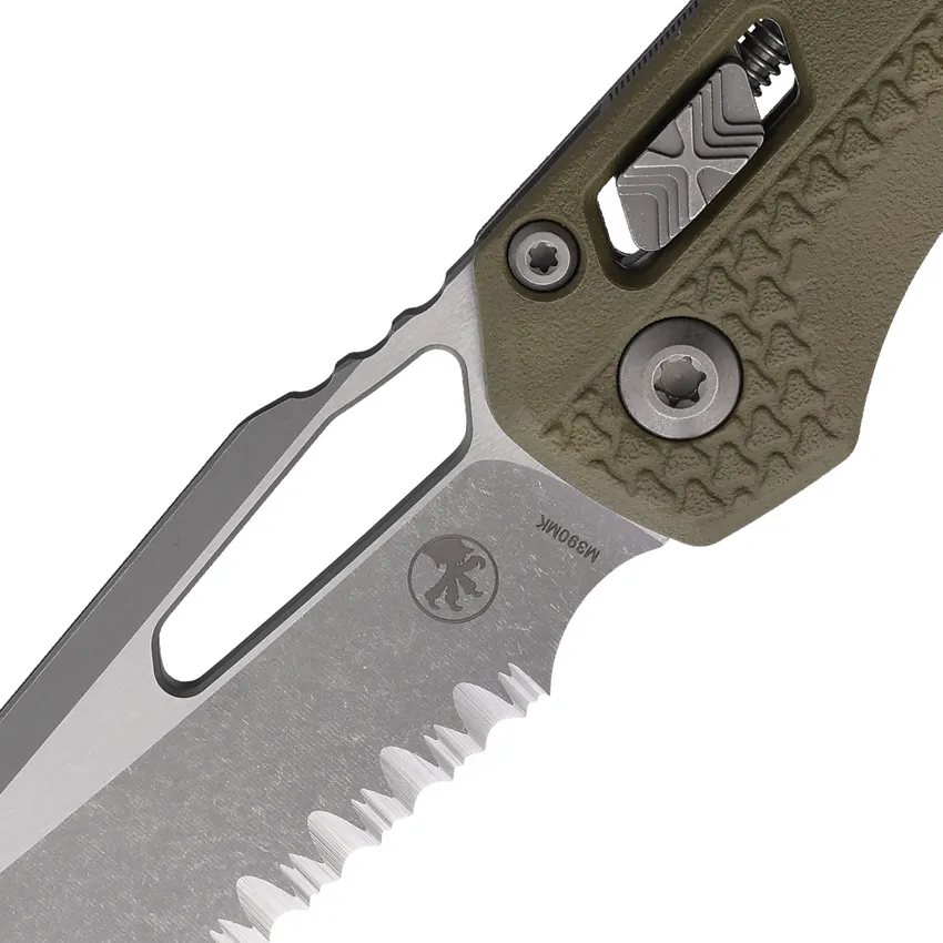 5" (12.7cm) closed. 3.75" (9.53cm) Apocalyptic finish partially serrated Bohler M390MK stainless sheepsfoot blade. OD green Tri-Grip polymer handle. Thumb pull. Lanyard hole. Pocket clip. Boxed.