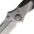 4.38" (11.13cm) closed. 3.5" (8.89cm) bead blast finish partially serrated premium steel tanto blade. Gray titanium handle with carbon fiber inlay. Thumb stud. Lanyard hole. Pocket clip. Boxed.
