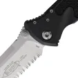 5.13" (13.03cm) closed. 4" (10.16cm) stonewash finish partially serrated premium steel blade. Black aluminum handle with black traction insert. Thumb stud. Lanyard hole. Glass breaker. Pocket clip. Boxed.