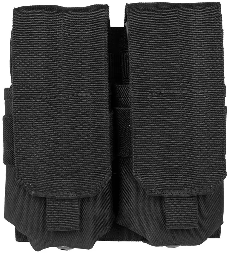 MOLLE system. Draining eyelet. Hook and loop closure. Holds four magazines. Polyester construction. Color: Black. Bulk packed.