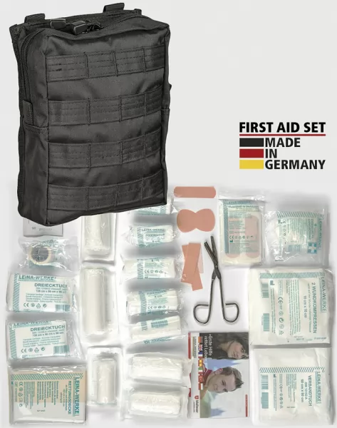 Contains: Assorted emergency bandages, scissors, four pair vinyl gloves, assorted sizes fixative bandages, rescue blanket, triangular bandages, tape, cleansing wipes, assorted sizes gauze dressing, compression bandages, and emergency instruction manual. Black nylon MOLLE compatible belt sheath. Bulk packed.