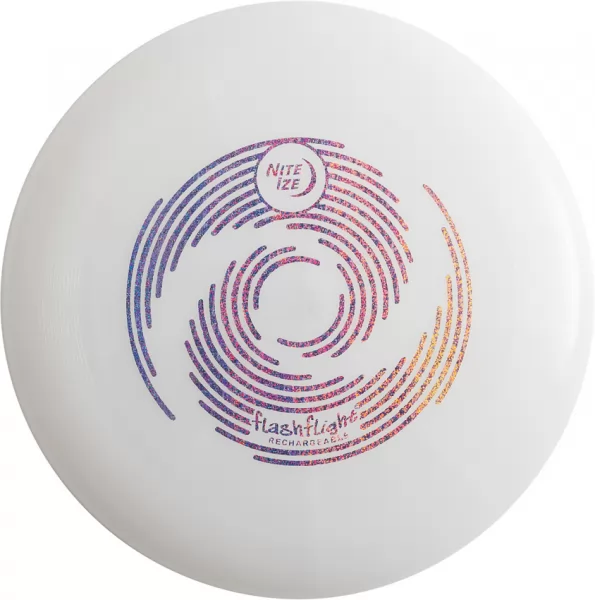 The Nite Ize FlashFlight Flying Disc (Model BRK-N05115) transforms outdoor fun with its vibrant, integrated LED illumination, making nighttime games a vivid spectacle. Engineered for smooth, stable flights, this disc features a durable construction that withstands countless throws and catches. Its bright, long-lasting LEDs ensure high visibility, keeping the game going long after sunset. Enjoy enhanced playtime with this luminous, durable disc, perfect for all skill levels. Rechargeable Disc-O Tech module features four selectable colors, color-changing Disc-O mode, and memory feature. Choose from four colors of red, green, blue, or white. 10.75" diameter. Water resistant and it floats. Recharges in approximately 2 hours using micro USB cable (not included). Run time: 5 hours. Boxed with hanging tab.
