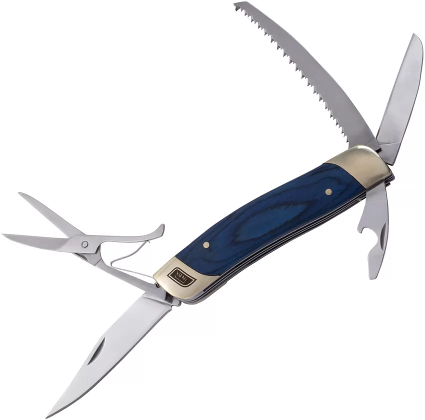 4" (10.16cm) closed. Satin finish 5Cr15MoV stainless clip and sheepsfoot blades. Blue wood handle. Brass bolster(s). Tools include: Bottle opener l Saw blade l Scissors l Screwdriver tip. Boxed.