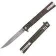 4.5" (11.43cm) closed. 3.5" (8.89cm) Damascus steel blade. Dark bronze matter Fat Carbon carbon fiber handle with gray titanium back handle. Pocket clip. Extended tang. Designed by Andrew Demko. Boxed.