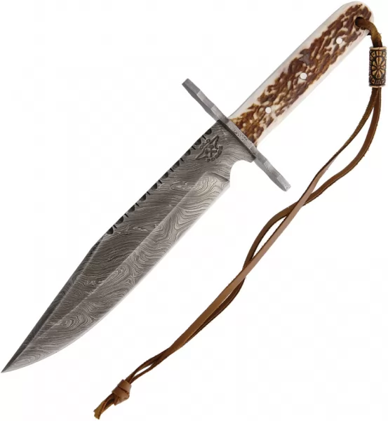 12" overall. 7.5" Damascus steel clip point blade. Stag bone handle. Damascus guard. Full tang. Lanyard hole. Brown leather lanyard. Brown leather belt sheath. Boxed.