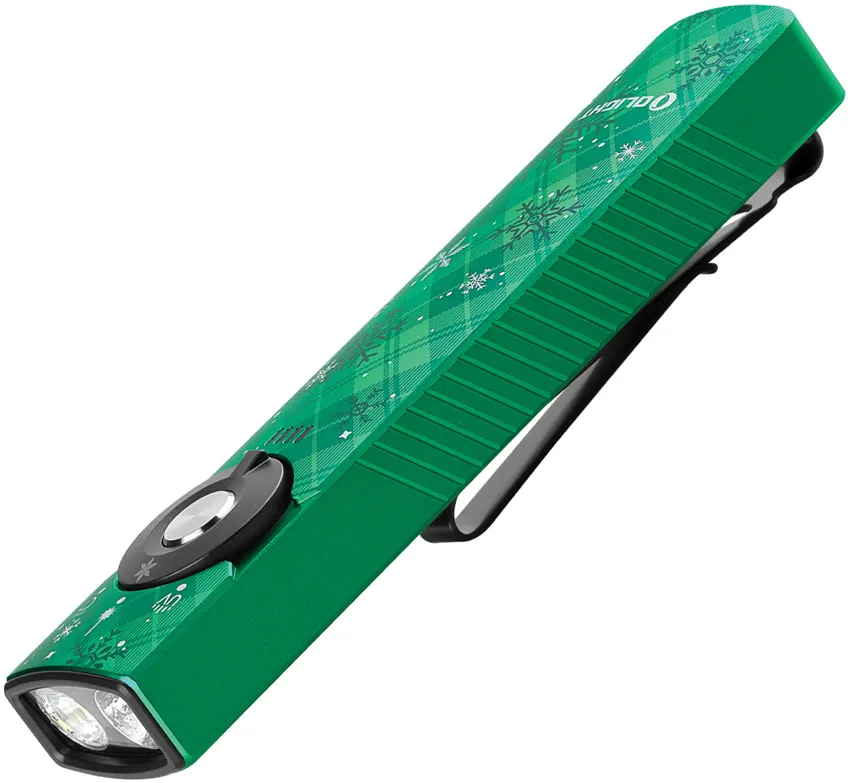 Dimensions: 4.72" x 0.63" x 1.06". Water resistant. Impact resistant. Rechargeable. Cool white LED. Green beam. UV light. Modes: Turbo (1300-420 lumens, 4+126m runtime); High (420-100 lumens, 135+12m runtime); Medium (100 lumens, 9h 45m runtime); Low (15 lumens, 55h runtime); Moon (1 lumen, 11 days runtime). MCC1A magnetic USB charging. 102m beam distance. Limited edition snowflake pattern. Requires (1) Lithium battery (included). Aluminum construction. Color: Green. Boxed.
