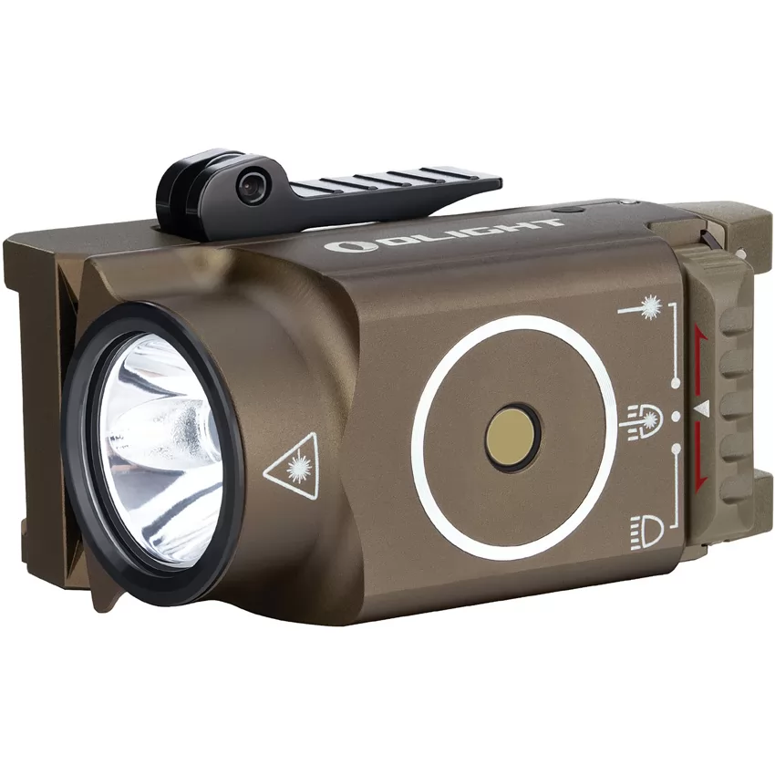 Dimensions: 2.24" x 1.29" x 1.41". Rechargeable. Water resistant. Impact resistant. Weapon mountable. Weight: 3.07oz. High performance cool white LED. Side switch. Green beam emitter. 600 lumens, 40m runtime. 130m beam distance. Magnetic charging cable. Compatible with Glock and Picatinny rails. Color: Desert tan. Requires (1) Lithium battery (included). Aluminum construction. Boxed.