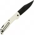 4.25" (10.8cm) closed. 3.38" (8.59cm) black finish 420 stainless clip point blade. White glass filled nylon handle. Lanyard hole. Pocket clip. Clam packed.
