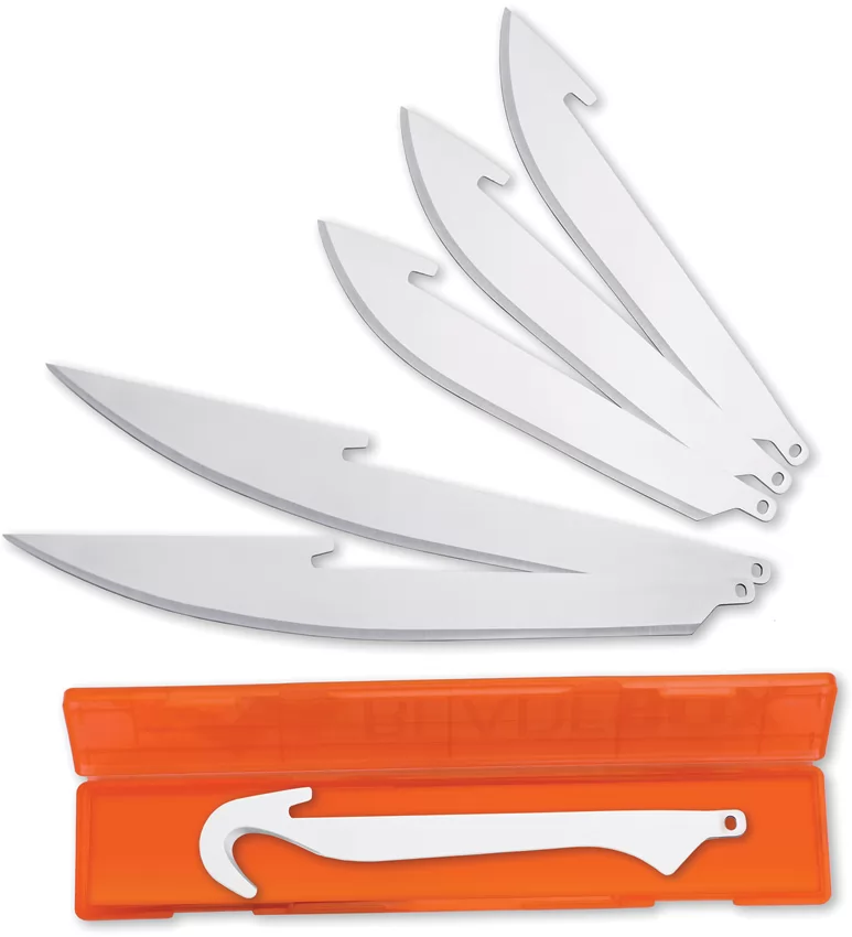 420J2 stainless blade. Includes: (3) 3.5" drop point blades; (2) 5" boning blades; (1) gutting blade. Fits all 3.5" folding and fixed blade RazorSafe System knives. Includes orange BladeBox. Note: the 5" blade cannot be closed and should be removed immediately after use and stored. Clam packed.