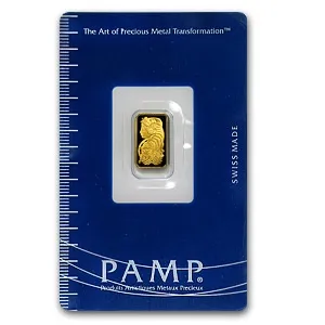 Gold and Silver products PAMP_SUISSE_1_GRAM Item Description:Acquire a tangible piece of security with the Pamp Suisse 1 Gram Gold Bar, crafted from .9999 fine gold. Manufactured by Gold and Silver Products, this investment-grade bar arrives sealed in its original assay card, guaranteeing its purity and weight. Each bar features the iconic Lady Fortuna design, a symbol of prosperity. This compact and trusted asset is a perfect addition to any precious metals portfolio.