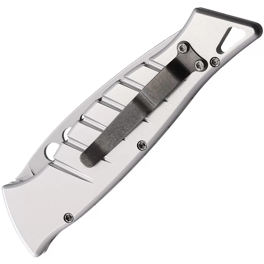 The Piranha Knives Auto Amazon Button Lock Slv model BRK-PKCP3S offers swift, reliable deployment and secure lockup. Crafted with precision, this automatic knife boasts a sleek silver finish and comfortable ergonomics. It's designed for demanding users who appreciate quality materials and dependable performance in a button-lock mechanism. Enjoy effortless one-handed operation and carry with confidence, knowing your blade is safe and ready when you need it. Automatic opening. 4.63" (11.76cm) closed. 3.25" (8.26cm) mirror finish 154CM stainless blade. Silver aluminum handle. Lanyard hole. Pocket clip. Boxed.