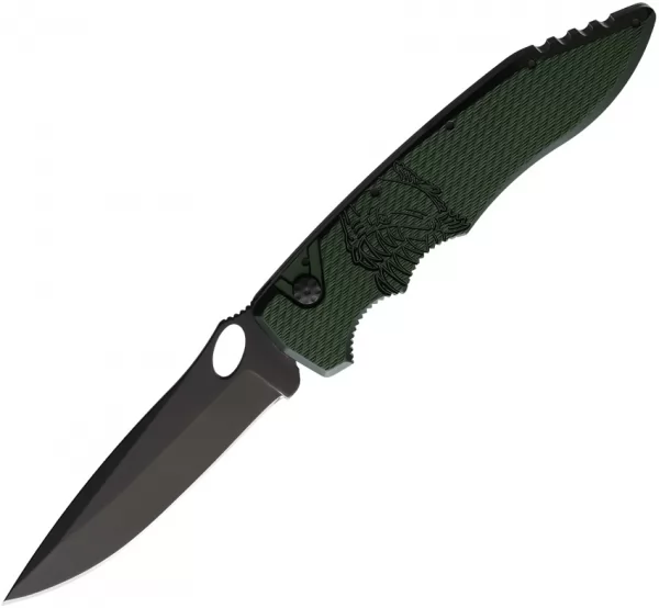 Automatic opening. 4.25" (10.8cm) closed. 3.5" (8.89cm) black oxide coated CPM S30V stainless spear point blade. Green aluminum handle. Thumb pull. Pocket clip. Boxed.