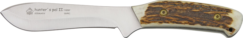 Puma Hunter's Pal II Stag. 8 1/4 overall. 4" stainless blade. Full tang. Genuine stag handles with lanyard hole. Leather belt sheath."