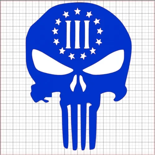 $2.99Vinyl Decals vinyl_punisher_III_percent_decal_6_blue Item Description:Back during the revolutionary war, when the USA was busy ridding themselves of British colonial rule, ordinary countrymen rose up as a militia and fought for their independence. History would have you believe that the entire country was in a battle against the British. This is not what happened at all. As a matter of fact the majority of the people either supported independence, supported British colonial rule, or simply did not care either way. A very small group of people did the actual fighting. These people included the signers of the Declaration of Independence and the armed militia that followed them. This group is known as the three percenters, and they still exist to this day through their family heritage and hereditary resolve for indepence from oppressive government control. Nothing puts this on prouder display that this vinyl decal that features the three percenter emblem sitting on punisher skull. This vinyl decal is blue and measures 6x6 inches.