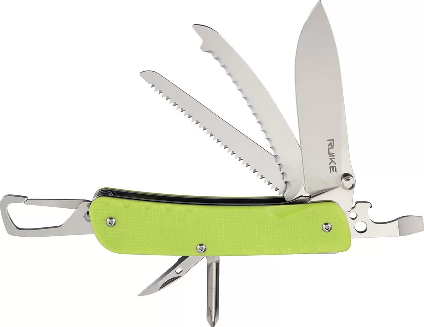 4.5" closed. Green g10 handle. Thumb stud. Tools include: Pocket clip l Glass breaker l Large blade l Belt/cord cutter l Saw blade l Large screwdriver l Bottle opener l Wire stripper l Reamer with sewing eye l Phillips screwdriver l Tweezers l Carabiner. Drill, facer Boxed.