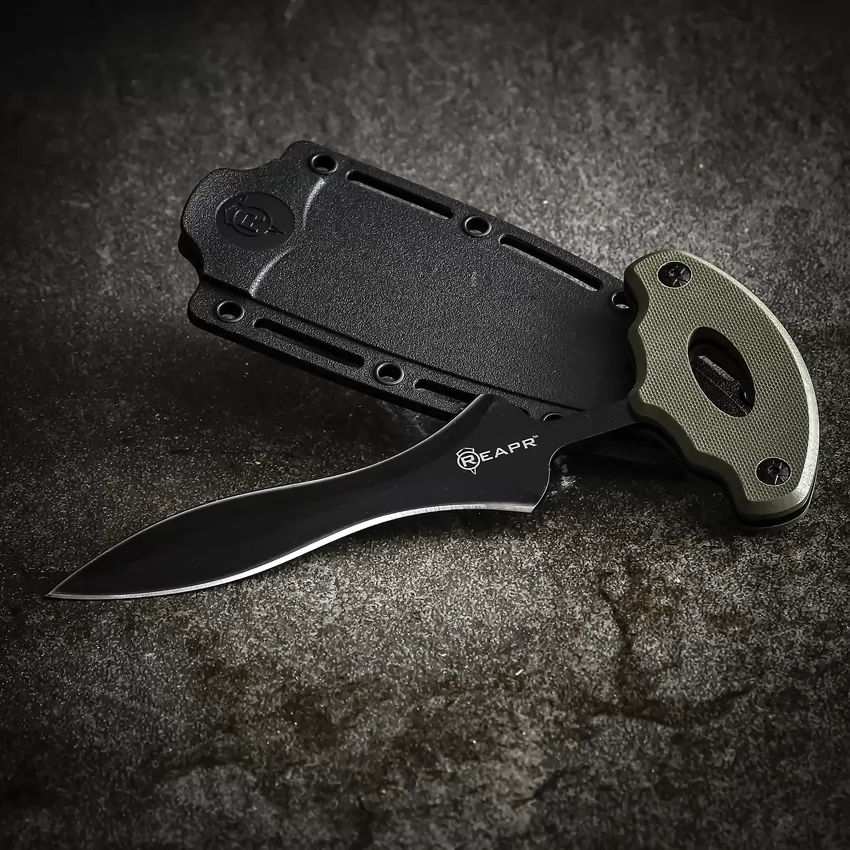The Reapr Versa Push Dagger (BRK-SHF11042) is a compact, formidable tool designed for discreet carry and close-quarters defense. Its durable, ergonomic handle provides a secure grip, while the sharp, double-edged blade delivers powerful piercing capability. A versatile addition to any EDC kit, the Versa Push Dagger offers reliability and confident control when needed most. Perfect for personal protection and utility purposes, this Reapr dagger is a practical and effective choice. 8.25" (20.96cm) overall. 4" (10.16cm) black oxide coated double edge 420 stainless dagger blade. OD green G10 handle. Full tang. Black injection molded belt sheath with clip. Clam packed.