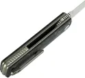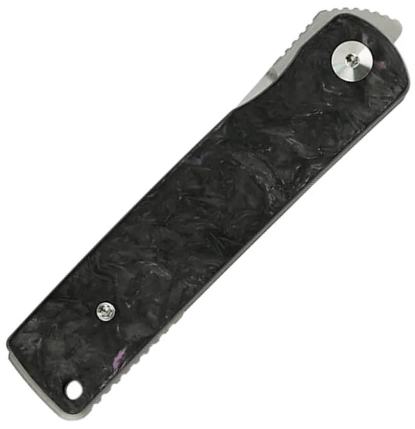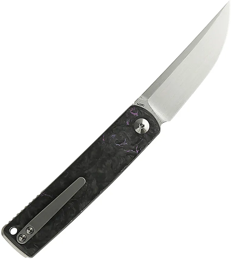 3.88" (9.86cm) closed. 2.75" (6.99cm) satin finish Bohler M390 stainless blade. Dark Matter purple carbon fiber handle. Pocket clip. Lanyard hole. Black nylon pouch. Boxed.