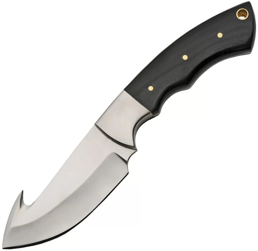 7.5" overall. 3.25" satin finish stainless guthook blade. Finger grooved buffalo horn handle. Stainless guard. Full tang. Lanyard hole. Brown leather belt sheath. Boxed.