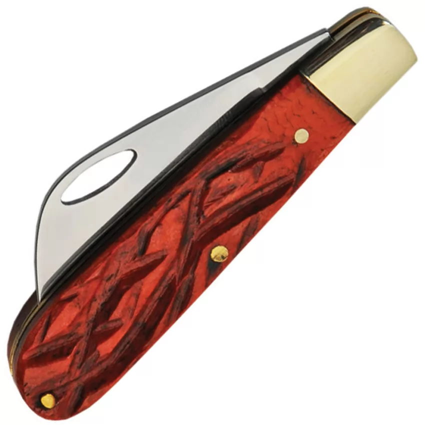 2.75" (6.99cm) closed. 2" (5.08cm) satin finish stainless hawkbill blade. Red jigged bone handle. Nickel silver bolster(s). Thumb pull. Boxed.