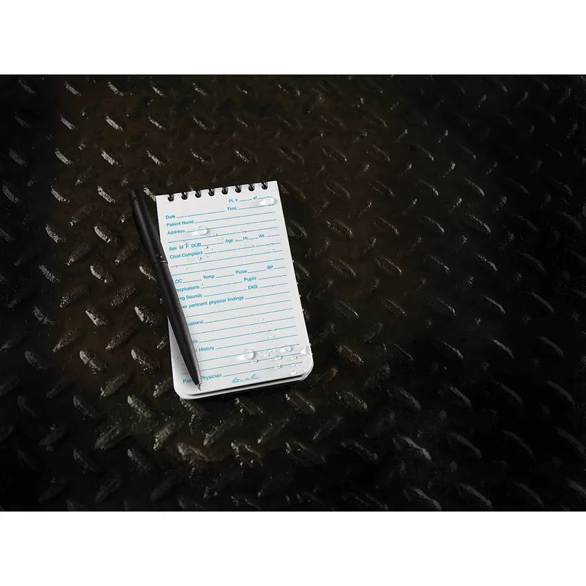 3" X 5" top spiral bound EMS notebook. Yellow Polydura cover. 50 sheets of white paper with vital statistics format. Features Rite in the Rain paper which sheds water and enables you to write in any weather. Bulk packed with hanging tab.