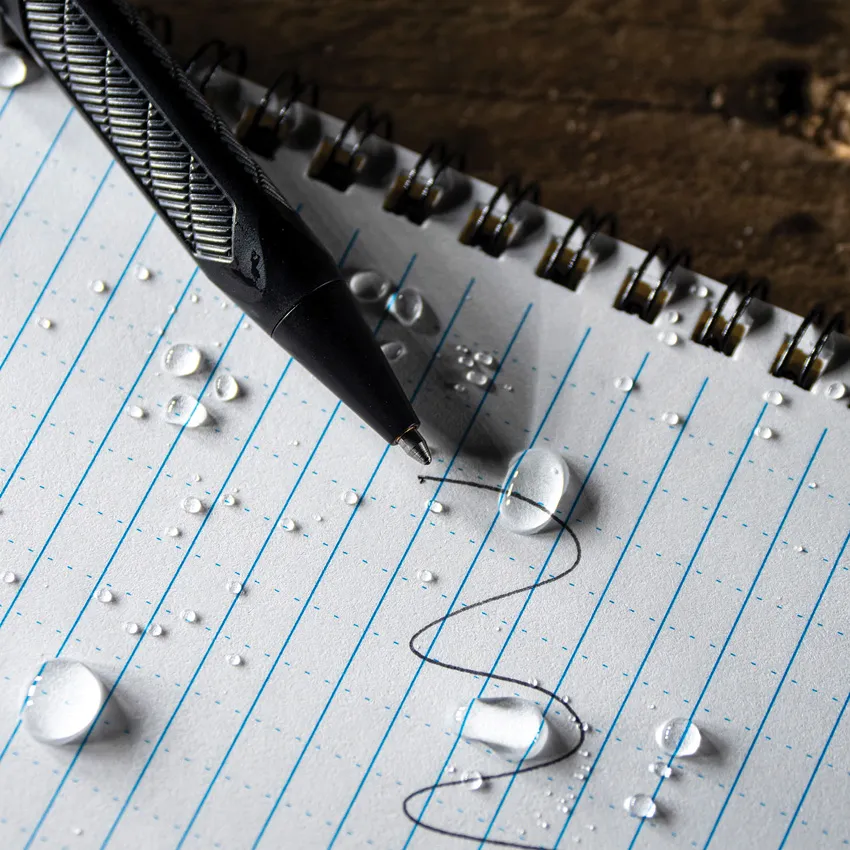 The Rite in the Rain Mini Bolt-Action Pen in Black (BRK-RITR20K) provides a compact and reliable writing tool, perfect for demanding environments. This pen features a durable metal body and a smooth bolt-action mechanism for effortless point deployment. It uses pressurized ink cartridges that write through water, grease, and extreme temperatures, ensuring your notes are captured no matter the conditions. Pocket-sized and robust, it's an ideal companion for outdoor adventures, fieldwork, or everyday carry. 4.5" overall. Pocket clip. Lanyard hole. Writes in any weather, upside down. Pressurized cartridge. Triangular barrel grip. Black ink. .9mm fine point. Brass tip. Color: Black. Clam packed.