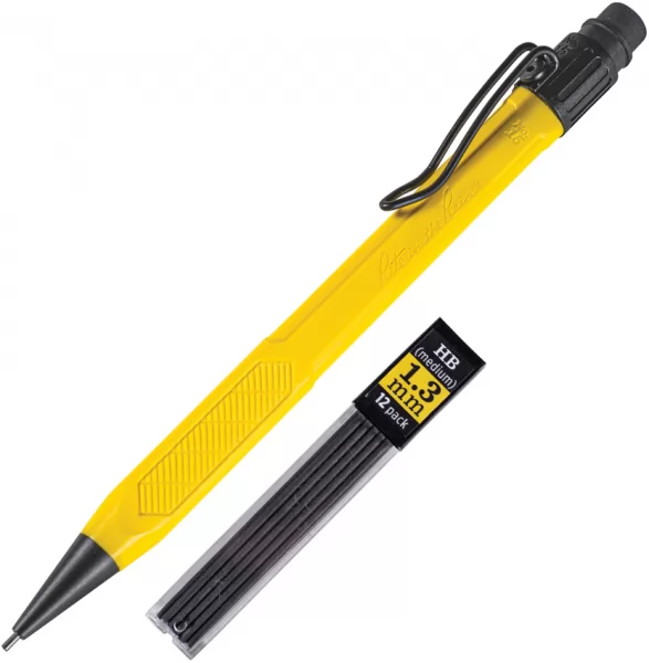 5.88" overall. Pocket clip. 1.3mm thick lead. Comes with pack of 12 refills. Triangular barrel with textured grip. Large eraser. Click lead advance. Aluminum tip. Color: Yellow. Hang packaged.