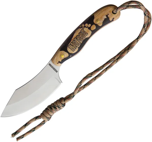 Rough Rider Knives presents the BRK-RR2174 Big Foot Hunter, a rugged fixed-blade designed for the outdoors. This knife features a durable stainless steel blade ready for tough tasks, complemented by a comfortable and secure wood handle adorned with Big Foot themed accents. The full tang construction provides strength and balance, making it a reliable companion for any hunting or camping trip. A genuine leather sheath is included for safe carry. Own a legend. 7.25" (18.42cm) overall. 3.25" (8.26cm) satin finish stainless blade. Wood handle. Lanyard hole. Full tang. Bigfoot handle artwork. Camo cord lanyard. Black nylon belt sheath. Boxed.