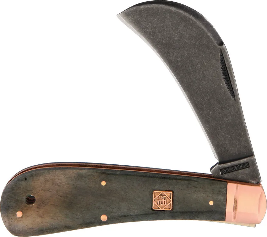 Immerse yourself in the precision and durability of the Rough Rider Copper Bolster Hawkbill RR1587. Crafted with a sleek 440 stainless steel blade and a handsome copper bolster, this knife exudes both style and functionality. Its ergonomic handle provides a secure and comfortable grip, ensuring effortless handling. The hawkbill blade excels in intricate cutting tasks, making it ideal for everything from detailed carving to skinning and field dressing game. With its dependable construction and elegant design, the Rough Rider Copper Bolster Hawkbill is the epitome of a reliable and versatile cutting tool. 4" closed. Black stonewash finish stainless hawkbill blade. Black smooth bone handle. Copper bolster(s). Lanyard hole. Inlay shield. Boxed.