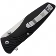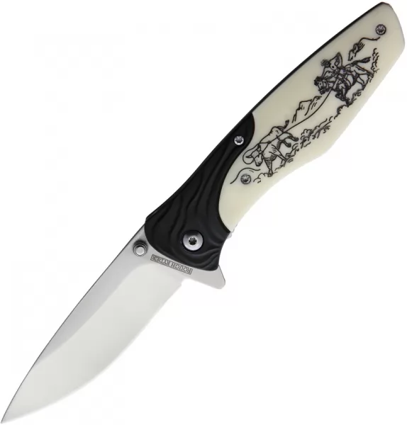 Assisted opening. 4.25" (10.8cm) closed. 3.25" (8.26cm) satin finish stainless blade. Black aluminum handle with white smooth bone front handle inlay. Thumb stud. Pocket clip. Cowboy scrimshaw handle artwork. Boxed.