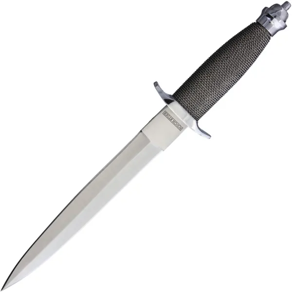 14.75" (37.47cm) overall. 9" (22.86cm) satin finish double edge stainless dagger blade. Wire wrapped handle. Stainless guard and pommel. Black leather belt sheath. Boxed.