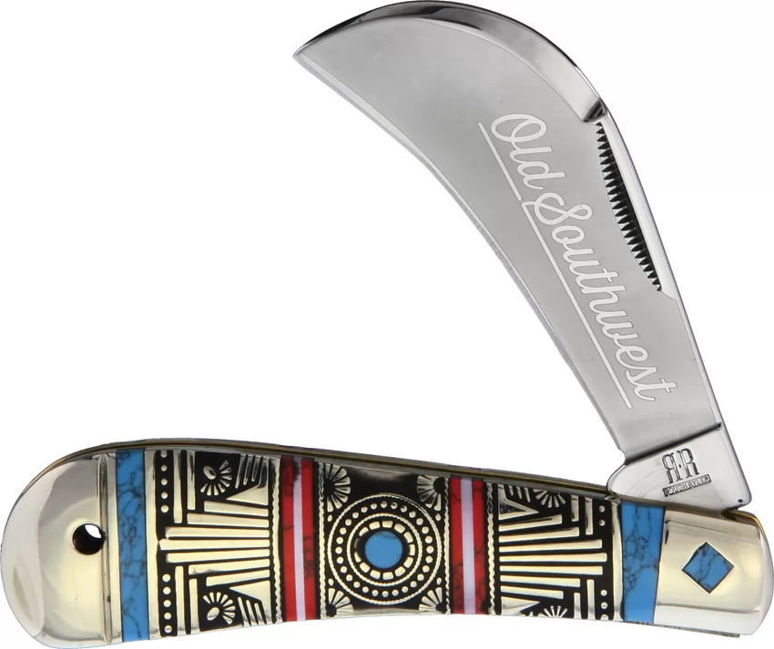Old Southwest Series. 4" (10.16cm) closed. Stainless hawkbill blade. Nickel silver bolster(s). Blade etching. Lanyard hole. Red and blue stone handle with southwest style nickel silver inlays. Boxed.