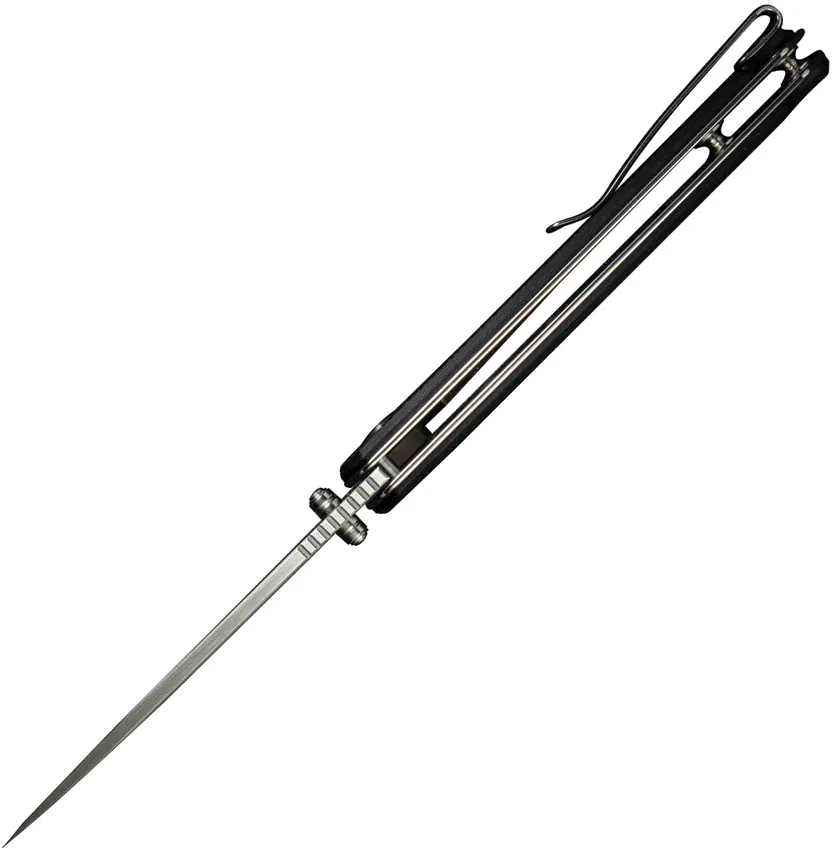 4.63" (11.76cm) closed. 3.63" (9.22cm) satin finish 9Cr18MoV stainless drop point blade. Black G10 handle. Extended tang. Thumb stud. Lanyard hole. Pocket clip. Black nylon zippered storage case. Boxed.