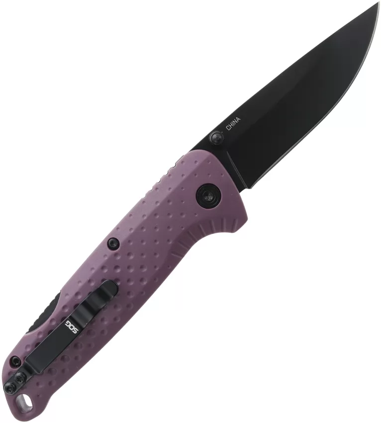4.25" (10.8cm) closed. 3" (7.62cm) black PVD coated 5Cr15MoV stainless blade. Purple glass filled nylon handle. Thumb stud. Lanyard hole. Pocket clip. Clam packed.