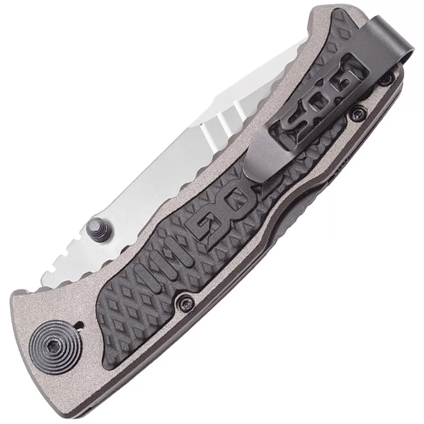 The Sideswipe Grey Tini by SOG Knives (model SOGSW1011CP) is a compact, yet versatile everyday carry knife that combines style and functionality. Crafted with a durable stonewash grey stainless steel blade and lightweight G10 handle, the Sideswipe offers exceptional corrosion resistance and ergonomic grip. Its compact size makes it ideal for discreet carry, while the assisted opening mechanism ensures quick and easy deployment. Whether you're slicing through envelopes or tackling light outdoor tasks, the Sideswipe Grey Tini is a reliable and stylish companion. Type: Assisted Opening; Closed: 4.375"; Blade: 3.375" | 7Cr15 Stainless | Standard Edge; Handle: Gray | Aluminum; Other Info: Pocket Clip | Thumb Stud(s) | Thumb Ridge. Gray TiNi finish blade. Black textured GRN handle inserts. Hang Packaged.