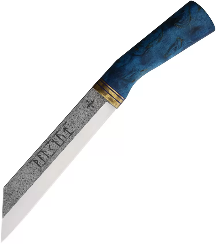11.63" (29.54cm) overall. 6.63" (16.84cm) stonewash finish Sleipner tool steel Wharncliffe blade. Blue curly Birch handle. Brass and blue accents. Black leather belt sheath. Boxed.