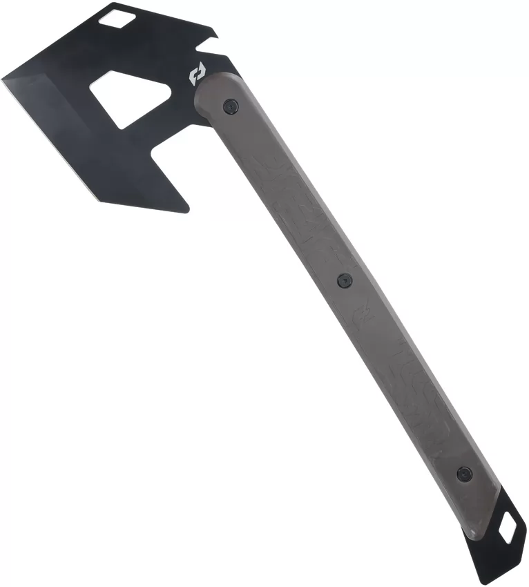 19.25" overall. 5.25" black oxide coated 3Cr13 stainless axe head with 6.25" cutting edge. Tan rubber handle. Full, extended tang. Lanyard hole. Black polyester belt sheath. Clam packed.